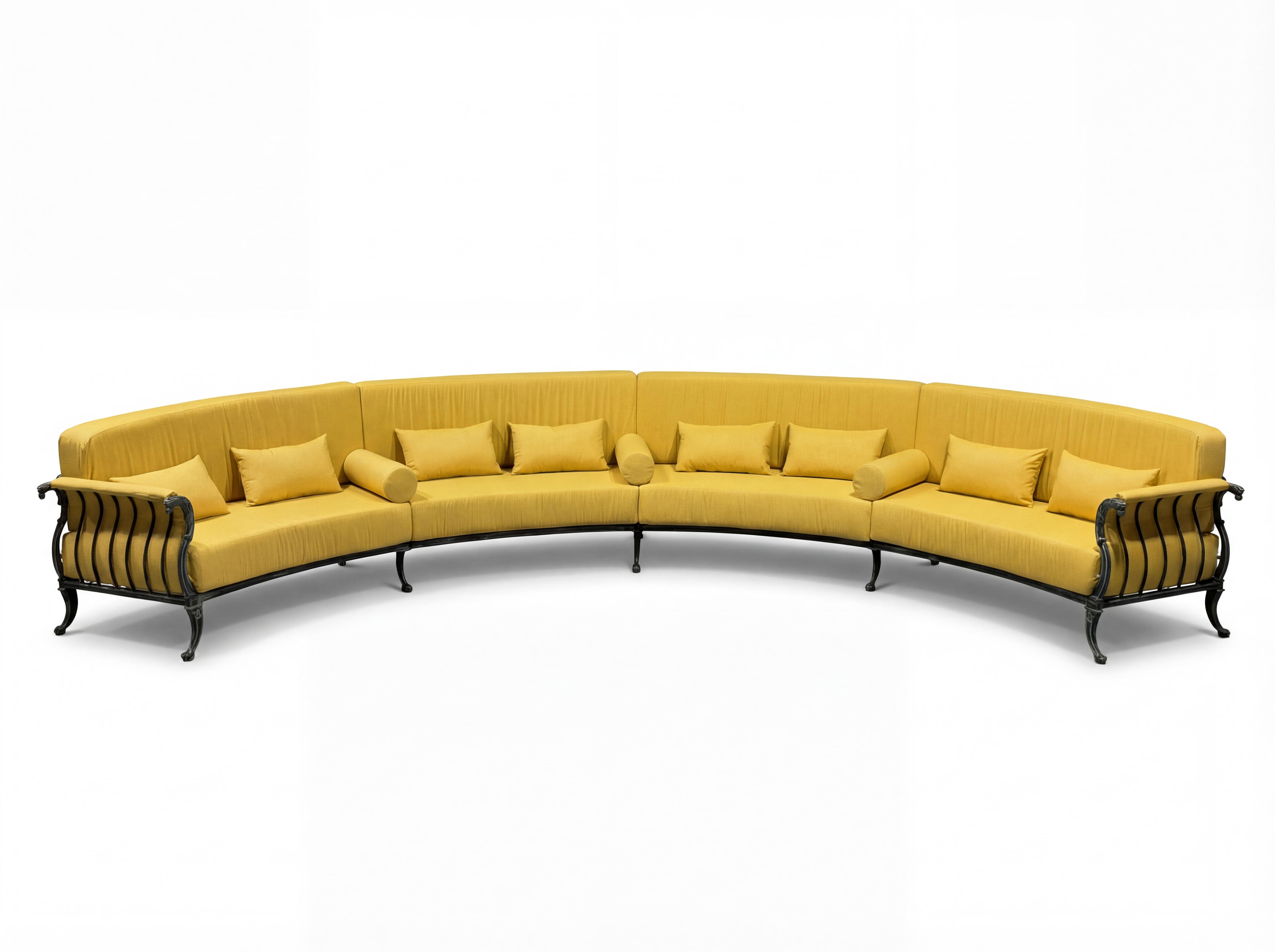 To complement the curve, we fabricated two matching bespoke curved coffee tables designed to sit flush against the sofa’s arc. Every element was hand-finished in our signature Bronze Verdigris, a complex, multi-layered finish that emulates the natural aging of bronze.